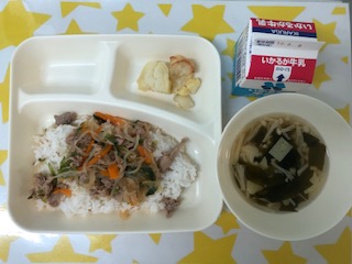 31日の給食は、豚丼・ゆばのすまし汁・やきじゃが・ごはん・牛乳です。