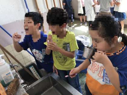 たくさんの子どもたちが給食後に歯みがきをしています。