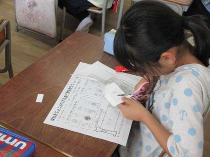 「骨をじょうぶにする食べ物」について学びました。プリントに切ったり、貼ったりして楽しくすすめました。