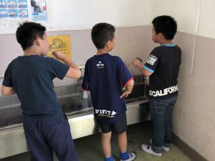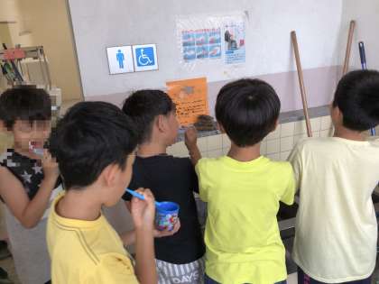 たくさんの児童が給食後に、ていねいに歯をみがいています。