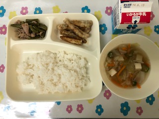 7日の給食は、いわし天ぷら・すまし汁・豚肉と三度豆のいためもの・ごはん・牛乳です。