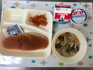 10日の給食は、えびのチリソース・中華スープ・ヨーグルト・大型コッペパン・牛乳・ブルーベリージャムです。