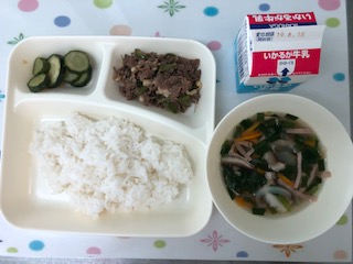 12日の給食は、チンジャオニューロウスー・ハムと野菜の中華スープ・きゅうりの辛味づけ・ごはん・牛乳です。