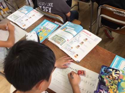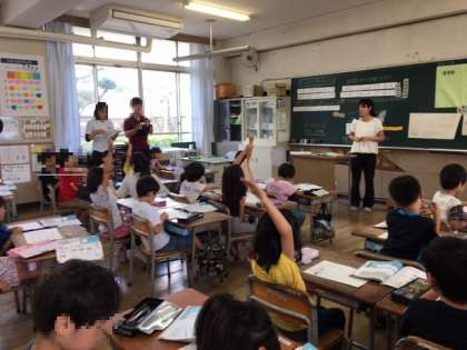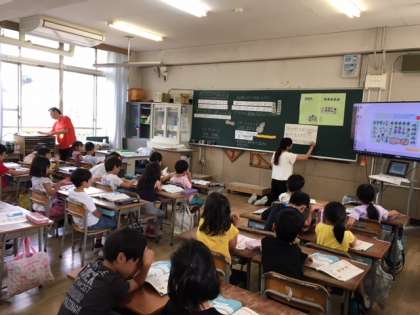 5時限目、1年2組で算数の研究授業が行われました。校内の先生方がたくさん集まって、子どもたちの様子を観察しています。
