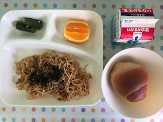 13日の給食は、焼きそば・オクラのかつお梅風味・オレンジ・黒糖1/2クレセントパン・牛乳です。