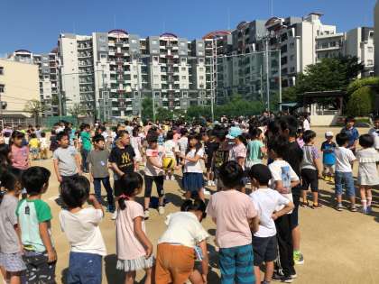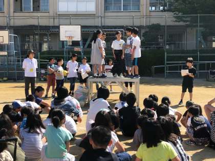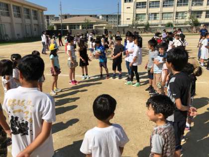 チームで協力して声掛けをしながらボール回しゲームをしました。