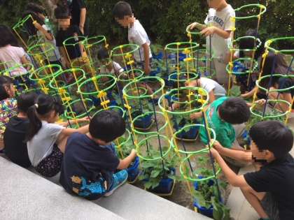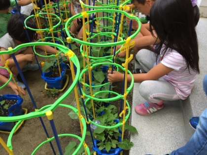 アサガオが成長して、つるがのびるように支柱を立てています。