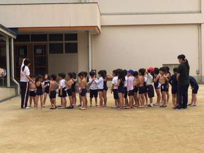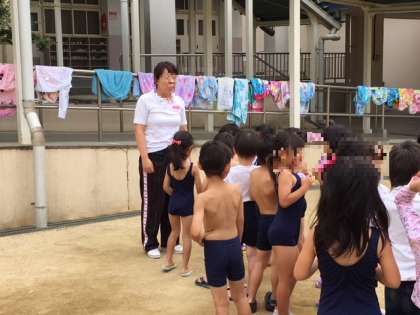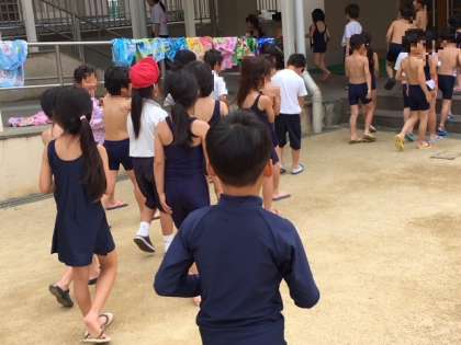 自分で水着に着替えること、帽子やゴーグル、バスタオルなどをもって集合する、準備運動、プールへの道筋など順番に教えてもらいました。
