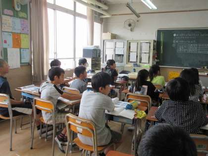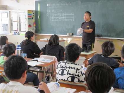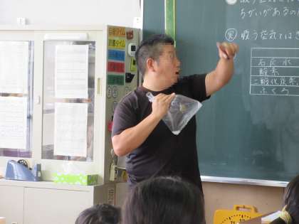 粉川先生が「人がはく息と空気のちがい」を調べるために、演示実験をしました。子どもたちは、興味深く実験の様子を見ています。