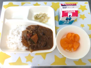 9日の給食は、夏野菜のカレーライス・キャベツのサラダ・みかん(缶)・ごはん・牛乳です。
