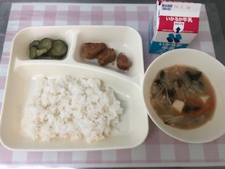 12日の給食は、豚肉の香味あげ・みそ汁・きゅうりの甘酢づけ・ごはん・牛乳です。