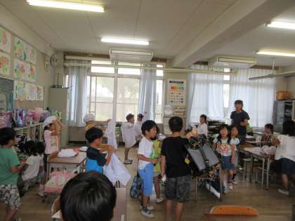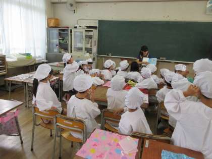 1年2組は給食の準備になりました。給食の白衣、帽子、マスクの用意、みんな早くできるかな。