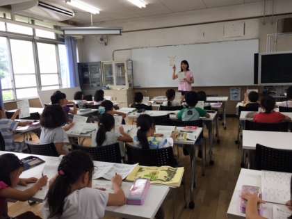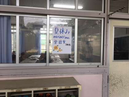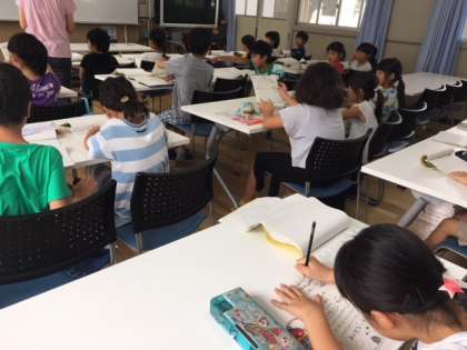 7月22日(月)夏休みのびのび学習では、先生の話を聞いて、夏休みの課題のプリントをやり始めました。