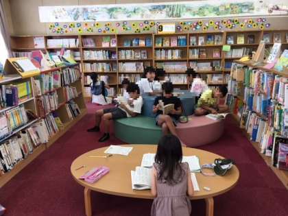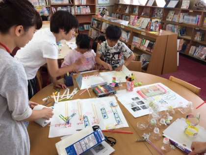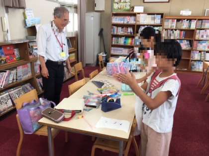 夏休みの図書開放の2日目は、図書館支援員の多田さんが「夏休みの工作」を教えてくださいました。図書ボランティアの方々も参加していただき、ストローやペットボトルで、竹とんぼなどをつくって遊びました。