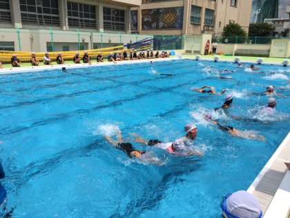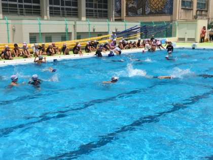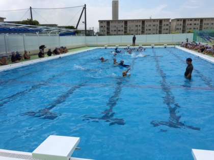 強い日差しの中、子どもたちは気持ちよさそうにプールに入っています。