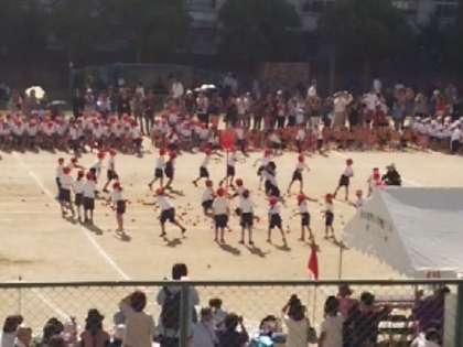 上の写真は、1年生の玉入れ「ねらって、あつめて!」