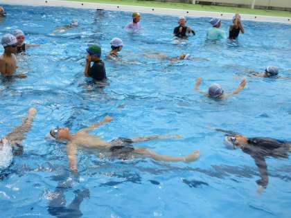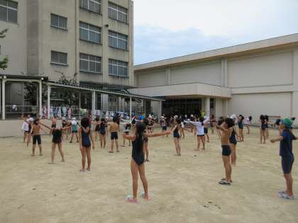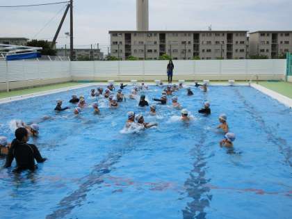 曇り空ですが、子どもたちは元気に準備体操をし、少し冷たいプールに入りました。