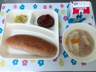29日の給食は、焼きハンバーグ・豆乳スープ・キャベツのカレーソテー・ライ麦パン・牛乳です。