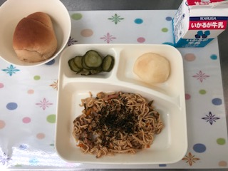 3日の給食は、焼きそば・きゅうりの甘酢づけ・なし(二十世紀)・黒糖1/2クレセントパン・牛乳です。