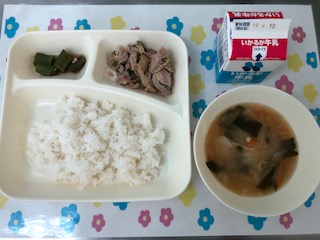 4日の給食は、豚肉の甘辛焼き・みそしる・オクラのおかかいため・ごはん・牛乳です。