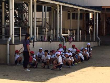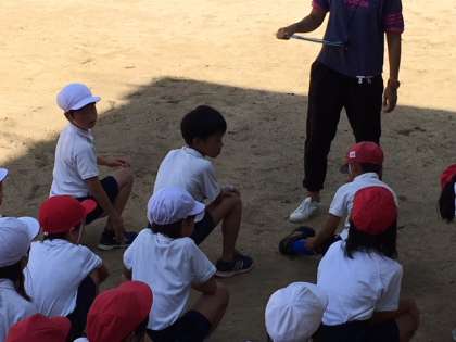 朝から快晴の青空で、日差しが強いです。3年1組の2時限目体育は、運動場ですが、暑さ対策で日陰を使いながらです。