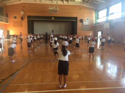 講堂の中は、陽があたらないですが、もうすでに熱い空気です。それにも負けず、子どもたちは、運動会の演技の練習に取り組んでいます。覚えた体の動きを音楽に合わせて、楽しいですね。