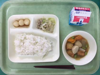 今日の給食は、野菜とさといもの煮物・豚肉とキャベツの炒め物・みたらしだんご・ご飯・牛乳です。