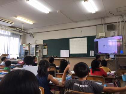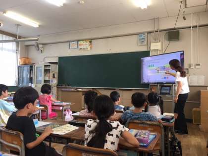 1年生は、算数の授業です。映像を見ながら、答えています。