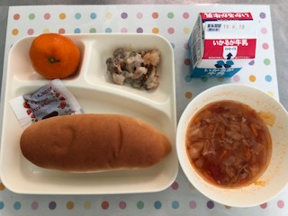 12日の給食は、豆乳マカロニグラタン【米粉】・トマトスープ・冷凍みかん・大型コッペパン・牛乳です。