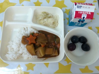 13日の給食は、チキンカレーライス【米粉】・キャベツのピクルス・ぶどう(巨峰)・ごはん・牛乳です。
