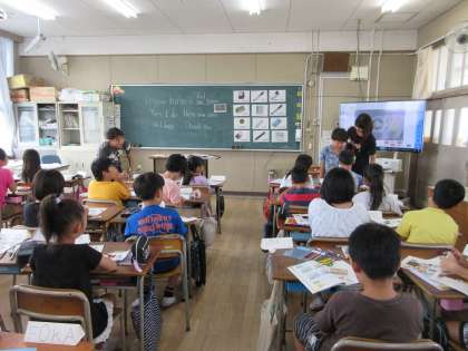 今日は、2時限目に外国語活動の授業をしました。桐島先生は、新井先生、今堀先生、実習生の逆瀬先生も見ている中、楽しく授業をすすめています。