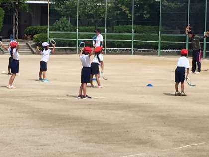 2時限目、1年生は運動場に出て、運動会の演技の練習です。