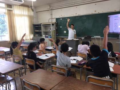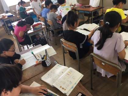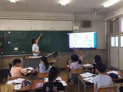 ノートに、ひっ算の計算を丁寧に書いています。先生が黒板に書いたひっ算を見ながら、答え合わせも一緒にしています。
