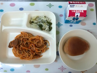 18日の給食は、イタリアンスパゲッティ・グリーンアスパラガスとキャベツのサラダ・黒糖1/2クレセントパン・牛乳です。