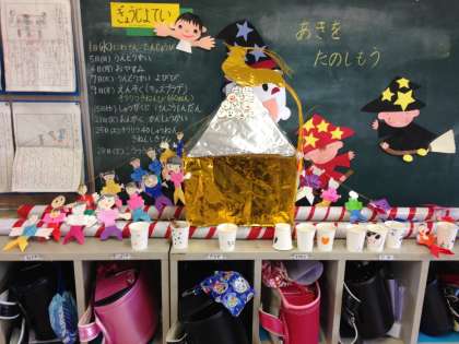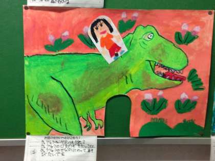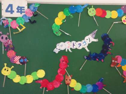 1年生は、生活科でみこしを作り、2年生は子どもたちが自分自身で本を選んでそれをもとに絵をかきました。4年生は、以前に紹介したドラゴンの作品です。