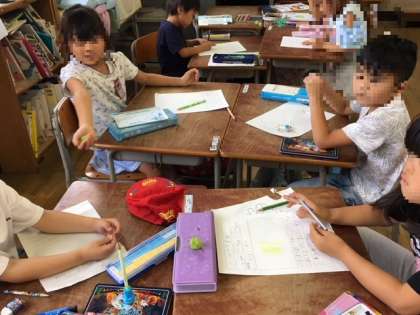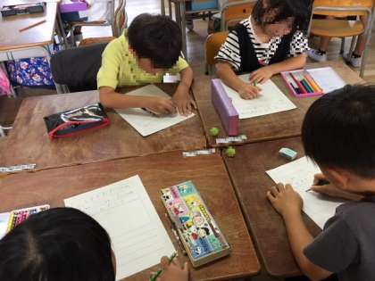 9月20日(金) 1年1組は、4時限目図工の授業で、「ふうせんかずらのみ」の色を塗っています。
