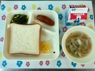 26日の給食は、フランクフルトのケチャップソース・スープ・さんどまめとコーンのサラダ・食パン・牛乳・マーマレードジャムです。