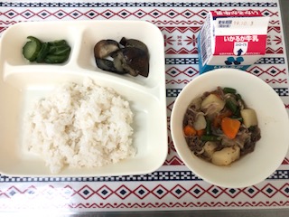 27日の給食は、肉じゃが・焼きなすのみそだれかけ・あっさりきゅうり・ごはん・牛乳です。