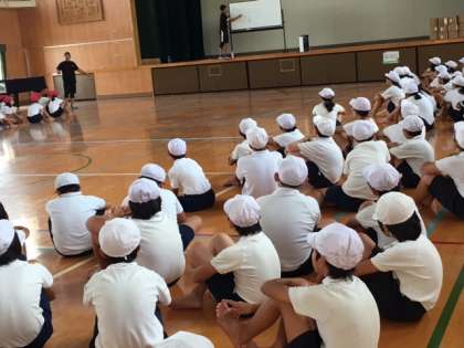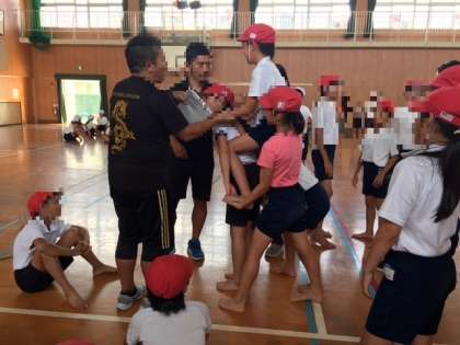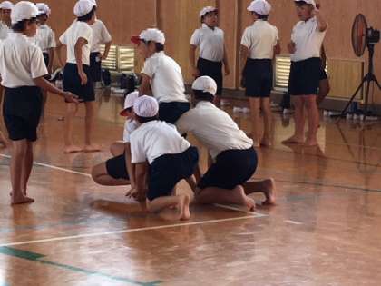 5年と6年は、5時限目に講堂に集合し、運動会の騎馬戦の練習です。