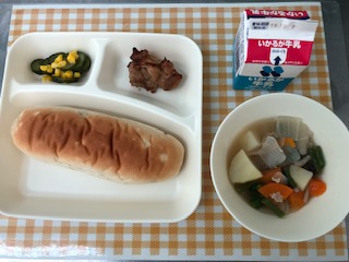 1日の給食は、鶏肉のみそマリネ焼き【ノンエッグドレッシング】・スープ煮・きゅうりとコーンのサラダ・おさつパン・牛乳です。