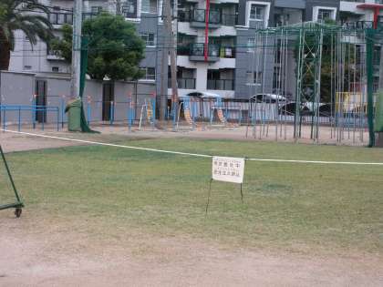 種まきの後、土をかけ、水分を与えています。今日から2,3週間は、芝生立ち入り禁止になります。種から芽が出て、芝が成長するのを待ちます。これから、緑色の芝生に変わっていくのを楽しみにしましょう。
