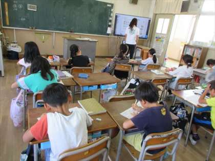 ここは、3年分割授業で1組の教室です。計算問題に取り組んでいます。