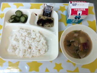 17日の給食は、おこのみやき・豚汁・きゅうりの甘酢和え・ごはん・牛乳です。