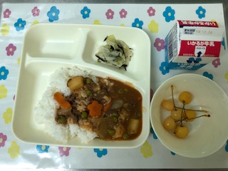21日の給食は、ハヤシライス【米粉】・キャベツのひじきドレッシング・さくらんぼ(缶)・ごはん・牛乳です。