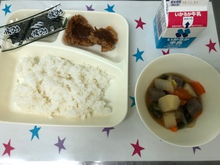 25日の給食は、みそカツ・じゃがいもと野菜の煮もの・焼きのり・ごはん・牛乳です。