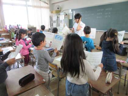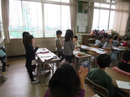 班ごとにカスタネットを鳴らして、歌を歌って発表しています。声も、楽器もいい音が出ていますね。