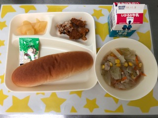 30日の給食は、なすのミートグラタン・鶏肉と野菜のスープ・白桃(カット缶)・大型コッペパン・牛乳・ソフトマーガリンです。