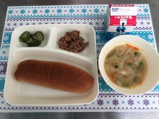 5日の給食は、豚肉のデミグラスソース・スープ・きゅうりのサラダ・黒糖パン・牛乳です。
