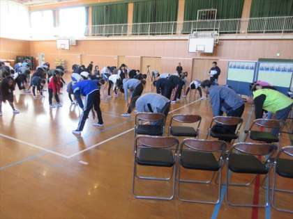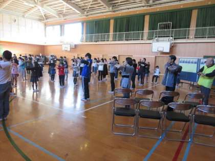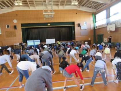 老人会の皆さんに、元気でいていただくため、みんなで「ヒガっち」の体操をしました。