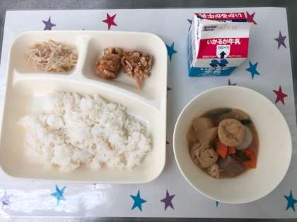 6日の給食は、あげどりのねぎだれかけ・含め煮・もやしのゆずの香和え・ごはん・牛乳です。